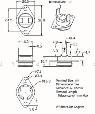 Thermostat, 1/2" Disc, Auto-reset, Normally Open, Vertical, Fixed Flange, N-Type (Normal Type), Terminal Size 187